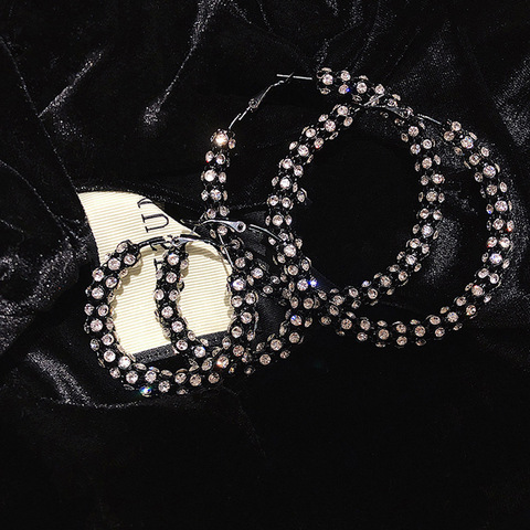 Glänzende Kristall Black Circle Ohrringe Vintage Punk Goth Korea Mode Big Hoop Ohrringe für Frauen
