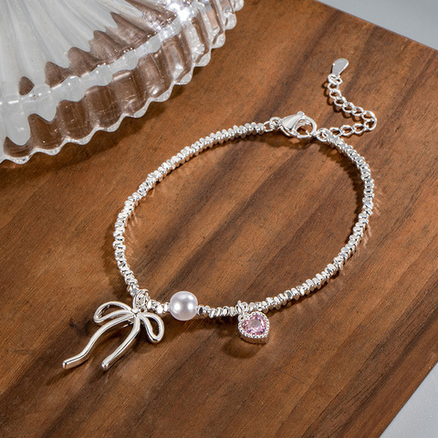 Squisita dolce ragazza argento placcato Y2k rosa braccialetto pendente con cuore di pizzo con fiocco di perle per le donne